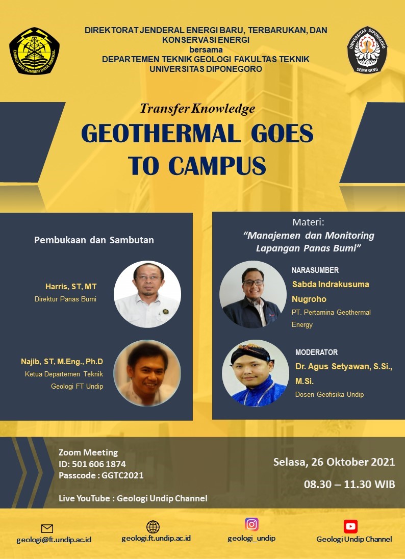 Transfer Knowledge: Geothermal Goes to Campus is an activity carried out by the Directorate of New Renewable Energy and Energy Conservation (EBTKE) as an effort to facilitate education in the field of geothermal energy. The activity was held on Tuesday (26/10/2021) at the Department of Geological Engineering, Faculty of Engineering, Universitas Diponegoro, which was attended by lecturers and students. The main target is students from the Department of Geological Engineering, which is most related to the theme of the activity.