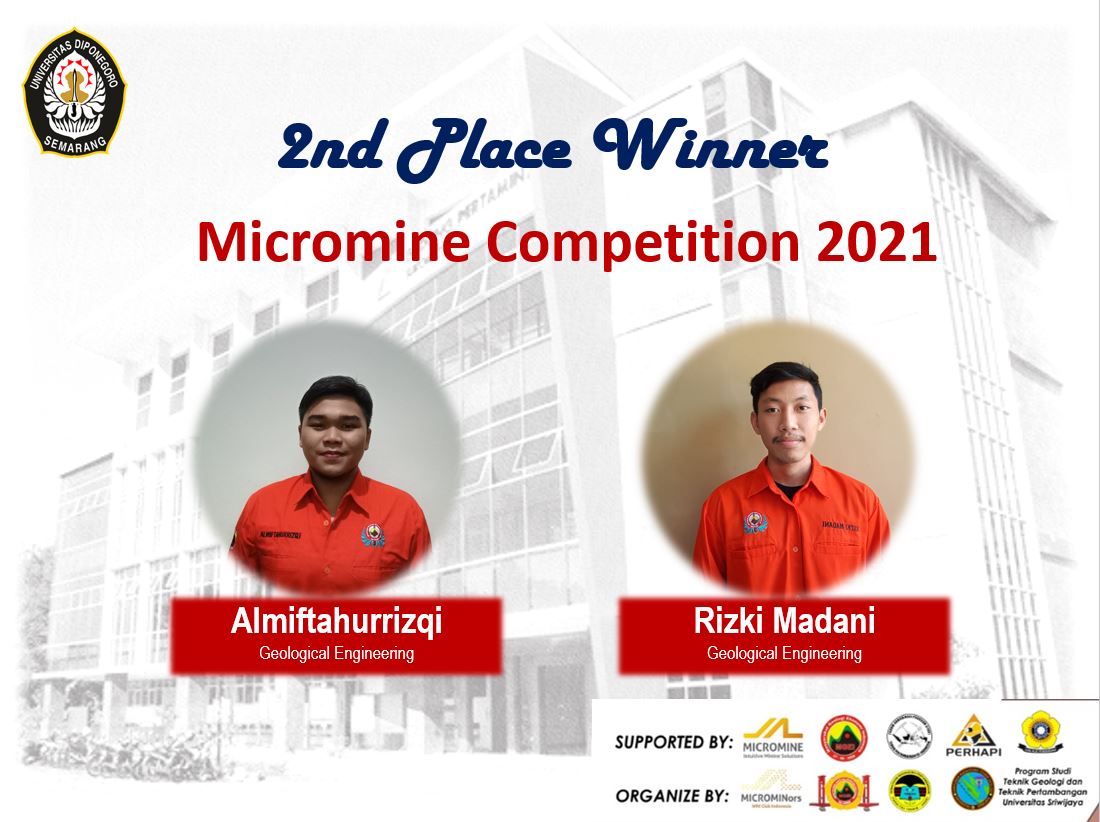 Perwakilan dari Departemen Teknik Geologi Undip melaksanakan presentasi babak penyisihan dan dinyatakan lolos pada 23 April 2021, sedangkan presentasi babak final adalah 3 Juni 2021. Berdasarkan penilaian tim dewan juri, terpilihlah pemenang pada bulan Juli 2021 dengan perwakilan  dinyatakan sebagai peraih Juara 2. Sebagai pemenang, Rizqi dan Rizki, mahasiswa angkatan 2018 berhak memperoleh hadiah uang tunai, sertifikat penghargaan, dan exclusive online training dari Micromine Indonesia. Dengan prestasi yang ditorehkan ini, tim memperoleh pengalaman dan kebanggaan yang tentunya memotivasi untuk terus belajar dan berkompetisi dengan lebih baik di masa depan.