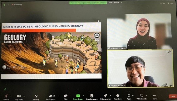 Dalam pelaksanaannya acara ini dibagi menjadi dua sesi, yang mana pada sesi pertama ini memiliki tema Sharing Session & Talkshow, yang diisi oleh Widiastuti Nur Farida yang saat ini sedang bekerja di Pertamina EP Cepu dan Maman Sudarman yang saat ini sedang bekerja di Pertamina PHE OSES. Dalam pemaparannya pembicara menjelaskan mengenai gambaran dalam proses recruitment, yang meliputi Document submission, TKD/TPA, Interview HC/psikolog, Interview UserMedical Check-up (MCU), dan Interview Top Management/Direksi. Selanjutnya pembicara juga menjelaskan mengenai peran geologist di perusahaan yang tentunya sangat beragam, serta membagikan beberapa persiapan untuk menuju dunia kerja, diantaranya mempelajari basic ilmu semasa kuliah dengan sebaik mungkin, meningkatkan softskill dan pengalaman, menentukan minat atau interest, memperbanyak kursus dan sertifikat keahlian, memperbanyak ibadah, memuliakan kedua orangtua, dan banyak bersabar serta yakin dibalik setiap kesabaran pasti ada hikmahnya. Setelah sesi sharing oleh pembicara selesai, kemudian dilanjut dengan sesi tanya jawab. Pada sesi tanya jawab ini para peserta diperbolehkan bertanya kepada pembicara mengenai topik ataupun pengalaman pembicara.