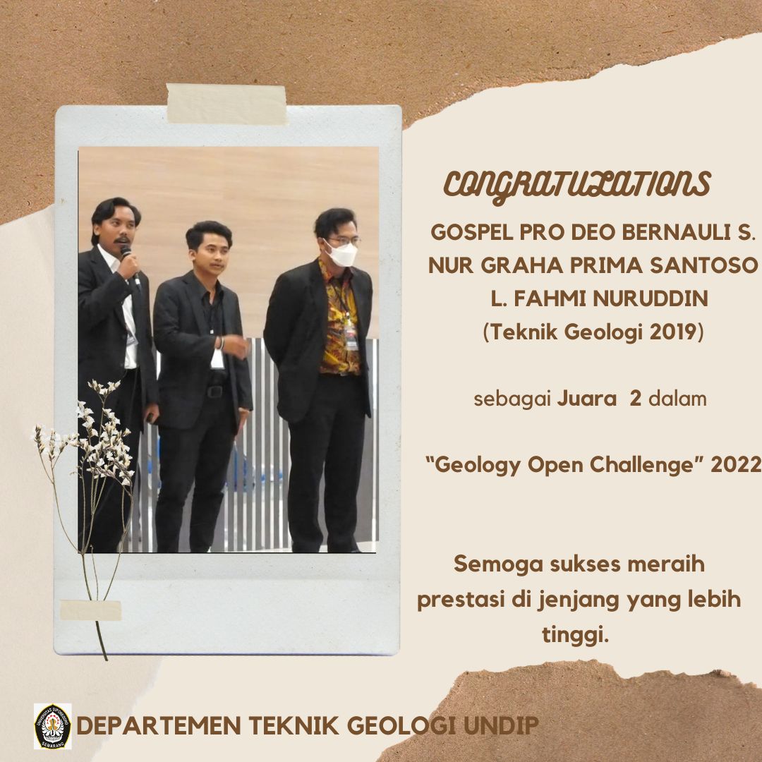 Bravo. Delegasi mahasiswa Teknik Geologi kembali mengukirkan prestasi di bidang akademik. Tim yang diwakili oleh Gospel Pro Deo Bernauli Sihaloho, Nur Graha Prima Santosa, dan L. Fahmi Nuruddin berhasil meraih gelar juara dalam lomba pemetaan “Geology Open Challenge (GOC) 2022” yang diselenggarakan oleh Teknik Geologi Universitas Jenderal Soedirman (UNSOED) Purwokerto. Perlombaan tingkat nasional ini diikuti oleh perwakilan mahasiswa-mahasiswa Teknik Geologi se-Indonesia dan mahasiswa Teknik Geologi berhasil menyingkirkan kompetitor lainnya sebagai juara ke-2.