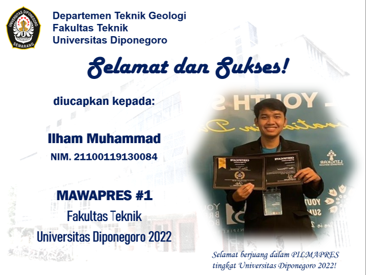 Ilham Muhammad, student of Geological Engineering Department from year 2019 won the most outstanding student at the Faculty of Engineering, Universitas Diponegoro in 2022. After going through the PILMAPRES selection process (Election of Outstanding Students) on March 24 – April 13, 2022, Ilham collected a total score of 702 ,74. This value is quite far above other candidates from other departments within the Faculty of Engineering.