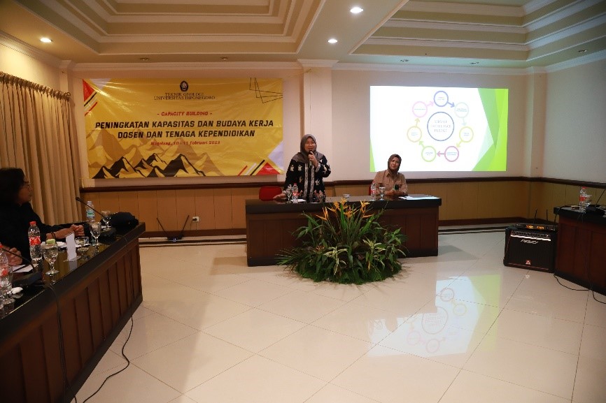 The management of the Geological Engineering Department decided to carry out Capacity Building activities on March 10-11 2023 at the Puri Asri Hotel, Magelang, Central Java. The activity was packaged in such a way that the participants did not feel bored participating in the activity. Speech by the Head of the UNDIP Geological Engineering Department, Dr.rer.nat. Ir. Thomas Triadi Putranto, ST., M.Eng., IPU., ASEAN.Eng started the Capacity Building activity on the first day. It followed by the delivery of material by Devina Trisnawati, ST., M.Eng with the topic “The Role of Lecturers and Education Staff in Creating Excellent Graduates”. The second topic “Commitment to Improving the Quality and Quality of Service to Students” was delivered by Rinal Khaidar Ali, ST., M.Eng. Interestingly packaged fun games such as guessing game add to the liveliness of the activities.