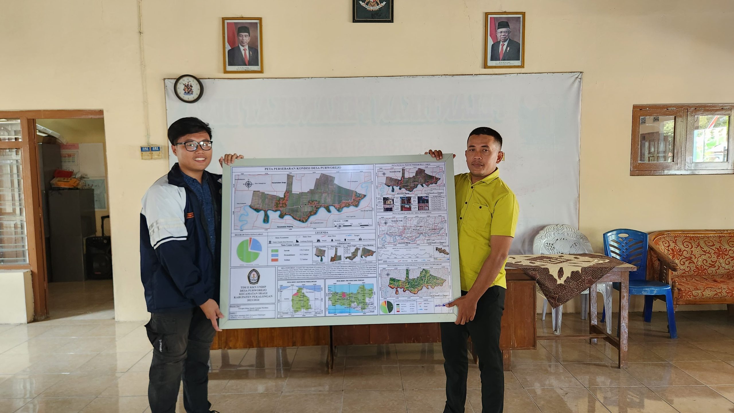 Pengumpulan data dilakukan dengan memanfaatkan berbagai sumber, termasuk data dari perangkat desa Purworejo, serta platform Rupa Bumi Indonesia dan Demnas. Pengolahan data dilakukan menggunakan perangkat lunak geospasial seperti ArcGIS, CorelDRAW, dan Google Earth. Proses pembuatan peta berlangsung selama satu hari, dengan hasil akhir berupa peta yang dicetak pada ukuran A0 dan dibingkai dengan rapi untuk memastikan ketahanan serta kualitas visual yang optimal. Penyelesaian peta dilaksanakan pada minggu kedua KKN, tepatnya tanggal 23 Juli 2024, dengan serah terima peta kepada perangkat desa berlangsung pada tanggal 1 Agustus 2024. Peta-peta tersebut kini dipajang di kantor Balai Desa Purworejo, di mana perangkat desa dan masyarakat setempat menyambut dengan antusiasme tinggi.