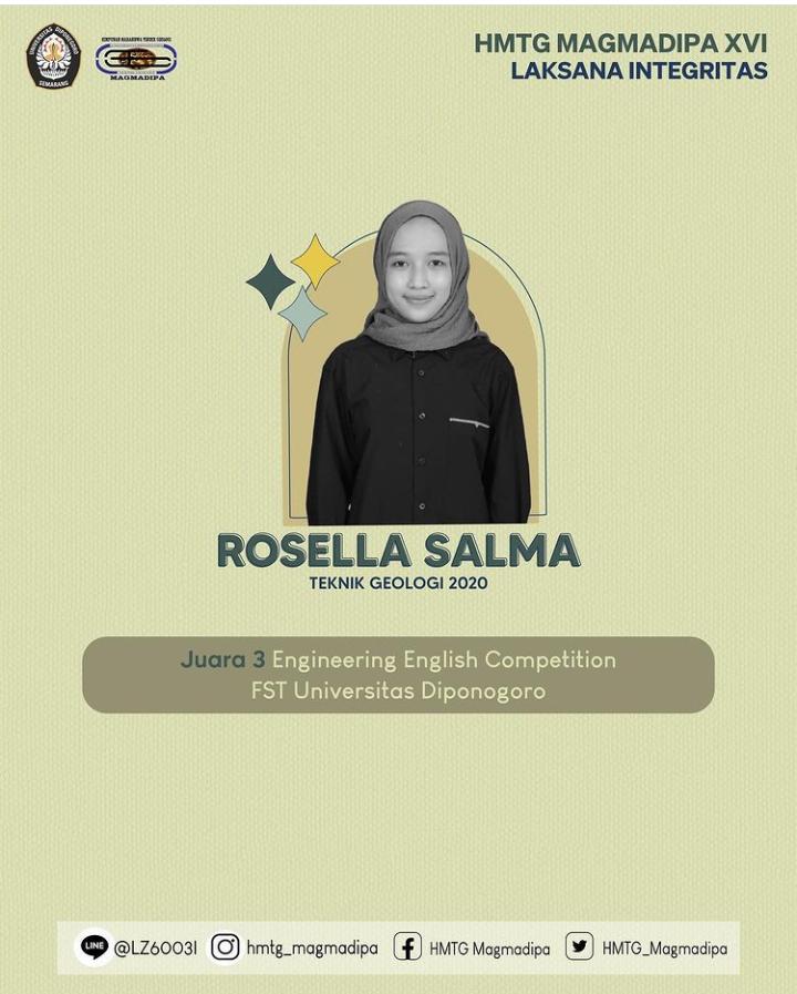 - Juara 3 Engineering English Competition FST Universitas Diponegoro diraih oleh Rosella Salma