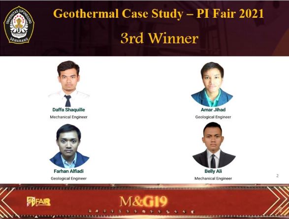 Mahasiswa Fakultas Teknik yang tergabung dalam Tim M&G19, beranggotakan Muhammad Farhan Alfiadi (Teknik Geologi), Amar Jihad Fadillah (Teknik Geologi), Daffa Shaquille (Teknik Mesin), dan  Belly Ali Rakhmadhansyah (Teknik Mesin) meraih prestasi Juara 3 dalam lomba Geothermal Case Study Competition – Petroleum Incorporated Fair (PI FAIR) yang diadakan pada 27 Juli – 10 September 2021. Ajang ini diselenggarakan oleh Program Studi Teknik Perminyakan Universitas Trisakti di bawah organisasi kemahasiswaan HMJ, SPE Student Chapter, dan IATMI Seksi Mahasiswa.